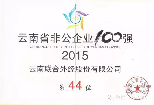 由云南省工商業(yè)聯(lián)合會(huì)和中國(guó)建設(shè)銀行云南省分行共同舉辦的“2015云南省非公企業(yè)100強(qiáng)發(fā)布會(huì)”,10日上午在昆明舉行,“2015云南省非公企業(yè)100強(qiáng)”、“2015云南省非公企業(yè)制造業(yè)20強(qiáng)”和“2015云南省非公企業(yè)服務(wù)業(yè)20強(qiáng)”榜單揭曉。云南聯(lián)合外經(jīng)有限公司再度入選100強(qiáng)企業(yè)。