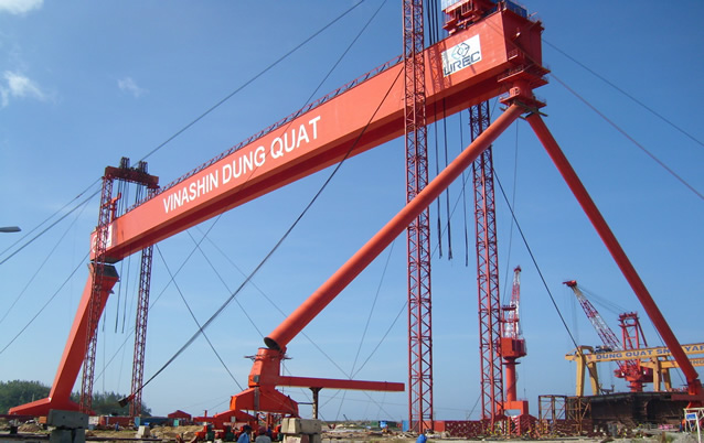 越南至今為止起重量及跨度最大的龍門式起重機(jī)---容橘船廠起重量350噸,跨度165米的龍門吊吊裝就位。巨大的UREC標(biāo)志屹立在越南上空。