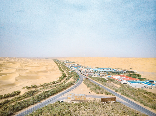 這是沙漠腹地的公路,路旁紅柳、梭梭等植物茂密旺盛,織起兩堵約一層樓高的綠墻,感覺越野車在植物砌起來(lái)的滑道里滑行。在這條橫穿世界第二大流動(dòng)沙漠——塔克拉瑪干沙漠的等級(jí)公路上,車行駛到高坡,才能看到遠(yuǎn)處的柏油路鑲嵌著兩道綠色,除此之外,黃沙一壟一壟的,頗似海浪涌向天邊。