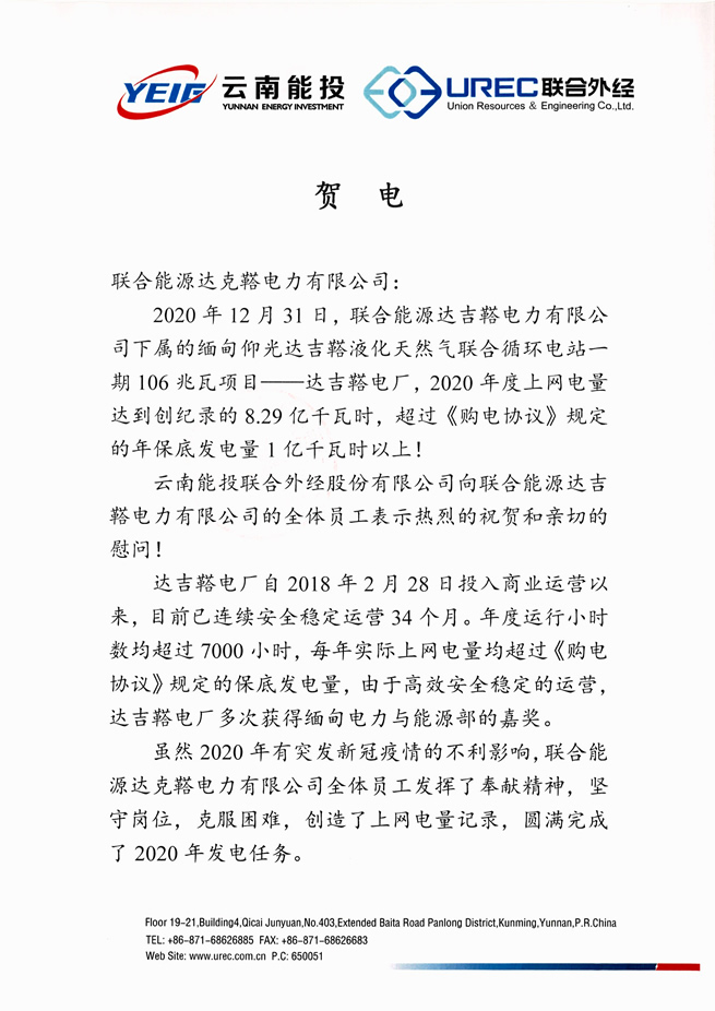 2020年12月31日,聯(lián)合能源達(dá)克鞳電力有限公司下屬的緬甸仰光達(dá)克鞳液化天然氣聯(lián)合循環(huán)電站一期106MW項(xiàng)目(以下簡稱“達(dá)克鞳電廠”) 2020年度上網(wǎng)電量達(dá)到創(chuàng)紀(jì)錄的8.29億度電,超過《購電協(xié)議(PPA)》規(guī)定的年保底發(fā)電量1億度以上!