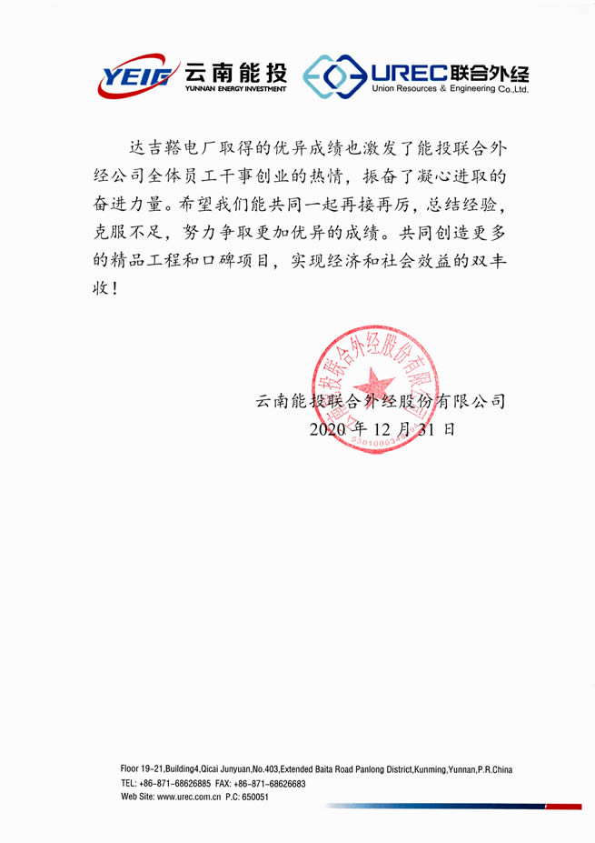 盡管今年有突發(fā)新冠疫情的不利影響,聯(lián)合能源達(dá)克鞳電力有限公司全體員工發(fā)揮了奉獻(xiàn)精神,堅(jiān)守崗位,克服困難,創(chuàng)造了上網(wǎng)電量記錄,圓滿完成了2020年發(fā)電任務(wù)。能投聯(lián)合外經(jīng)總經(jīng)理馮柯向達(dá)克鞳項(xiàng)目公司表達(dá)了祝賀,并勉勵聯(lián)合外經(jīng)所有同仁2021年再創(chuàng)佳績!